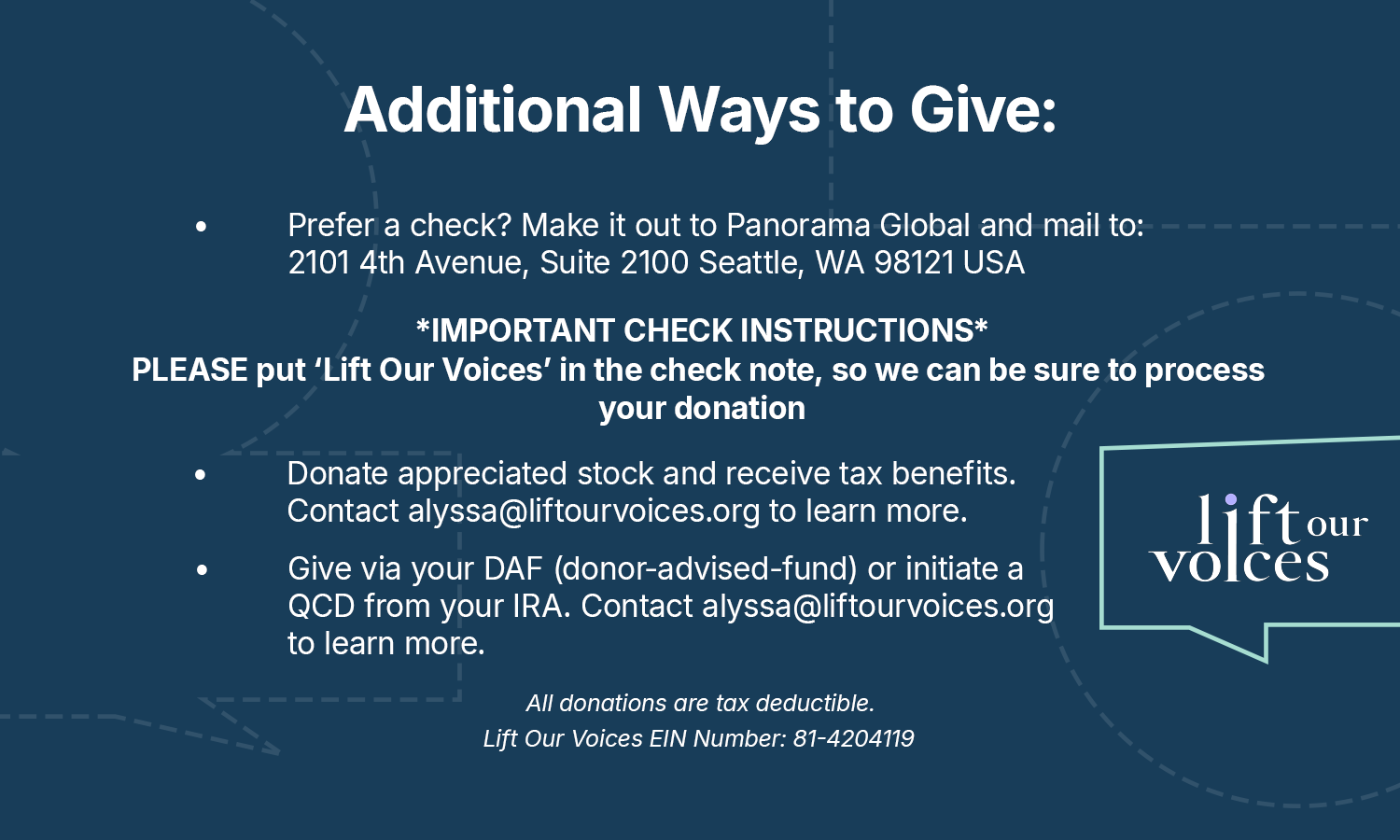 Lift Our Voices has fiscally sponsored 501(c)(3) status from Panorama Global. All donations are tax deductible.